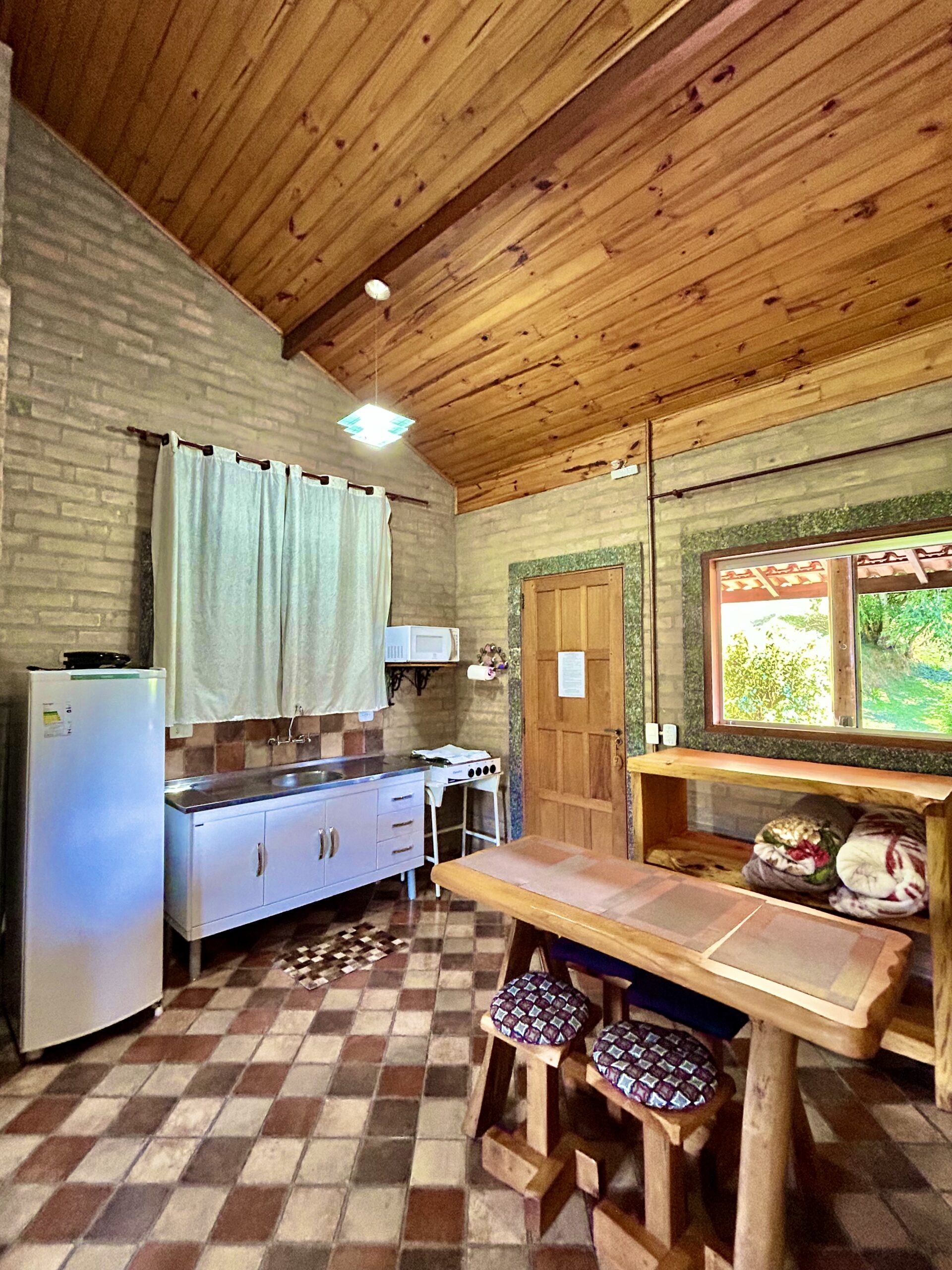 Chalé amplo, rústico e confortável. Localizado na parte alta da pousada. Com cama de casal rústica, TV, sofá, ventilador de teto, cozinha equipada com pia, geladeira, micro-ondas, fogão (sem forno), mesa para refeições e todos os utensílios. A lareira aquece todo o chalé.
